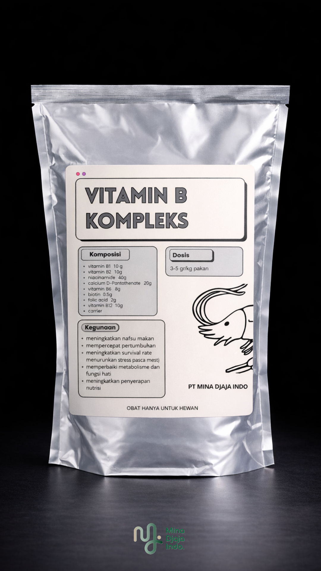 Vitamin B Kompleks terdiri dari berbagai jenis vitamin B yang berfungsi sebagai pendukung metabolisme energi, meningkatkan nafsu makan, serta membantu proses pertumbuhan dan efisiensi pakan. Sangat bermanfaat untuk menjaga vitalitas organisme tambak dalam kondisi budidaya intensif.